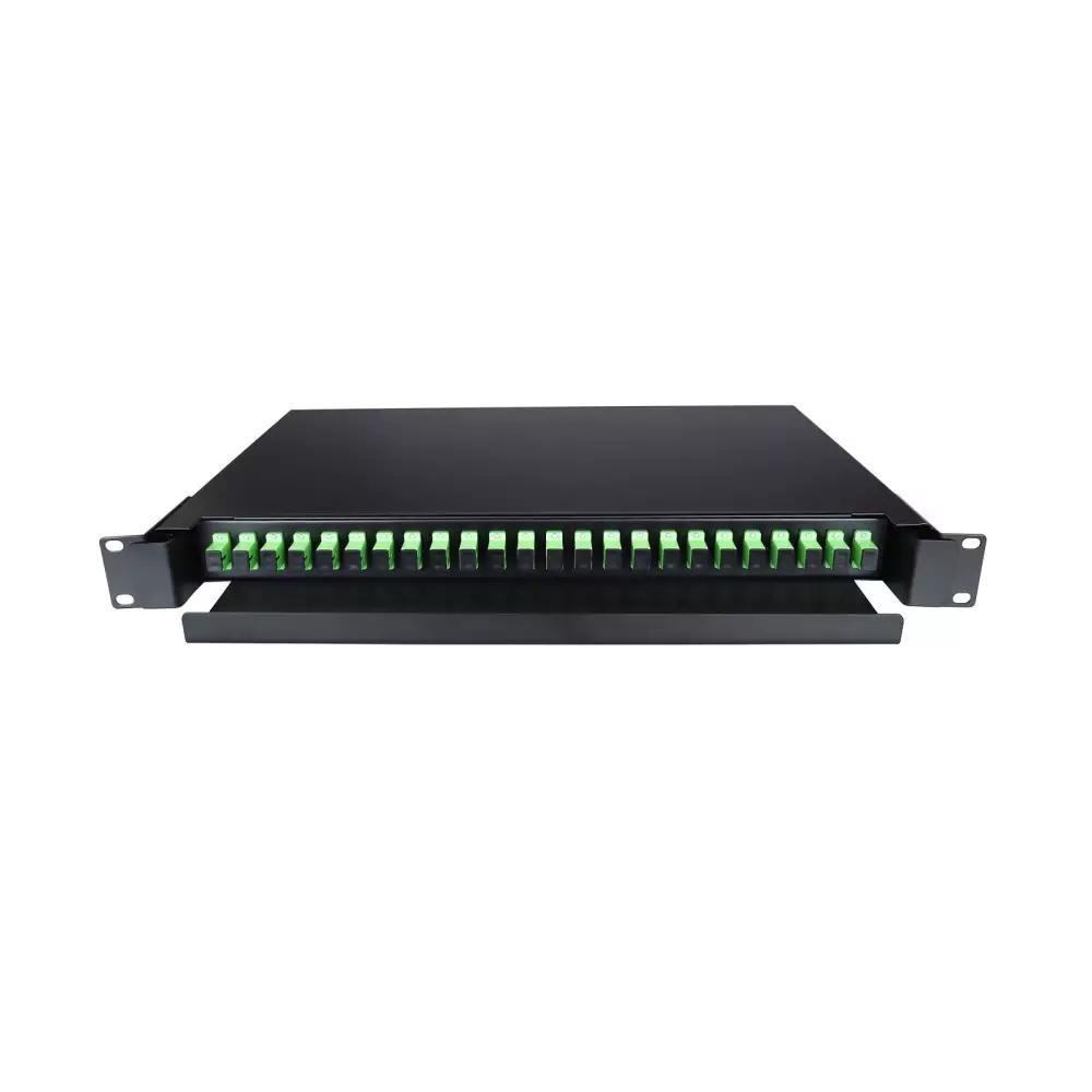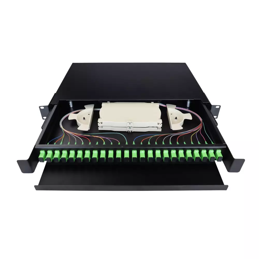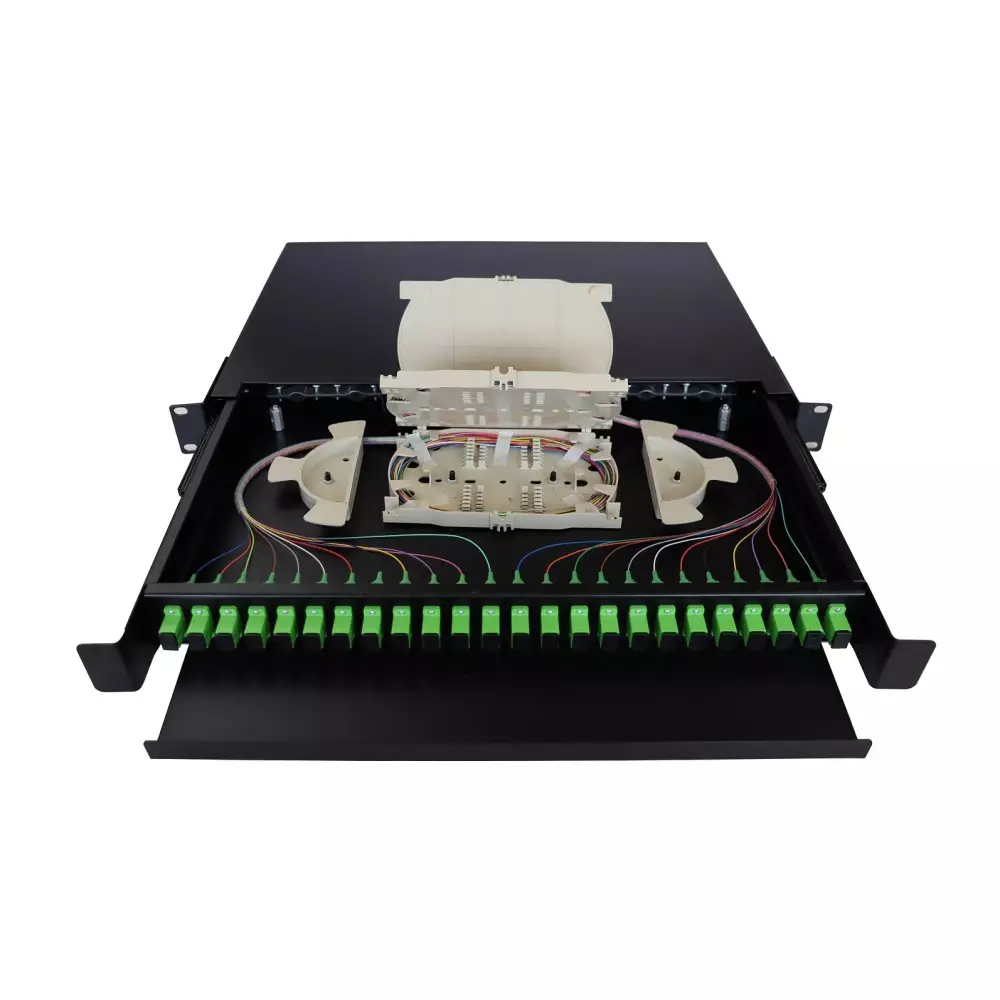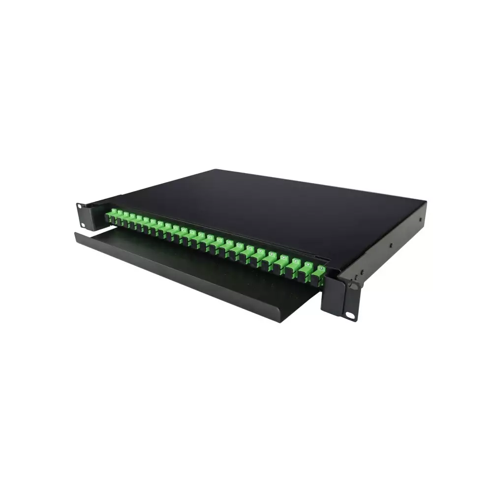 Bandeja extraíble de fibra óptica de 1U para rack de 19”, diseñada para entornos profesionales como centros de datos y redes FTTH. Permite alojar hasta 24 conexiones SC o LC dúplex, e incluye pigtails y adaptadores SC/APC. Su diseño modular optimiza la instalación, la fusión y la gestión del cableado de forma segura y eficiente
