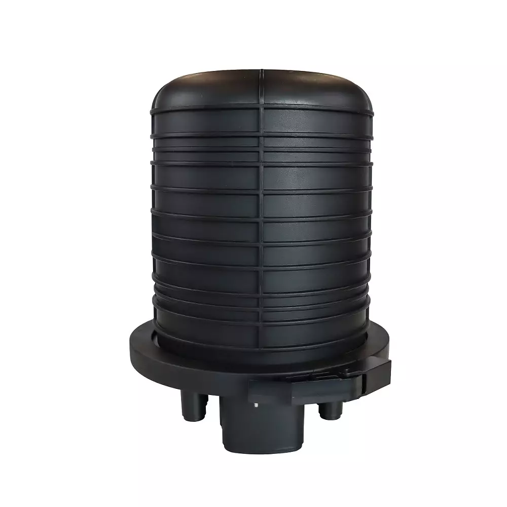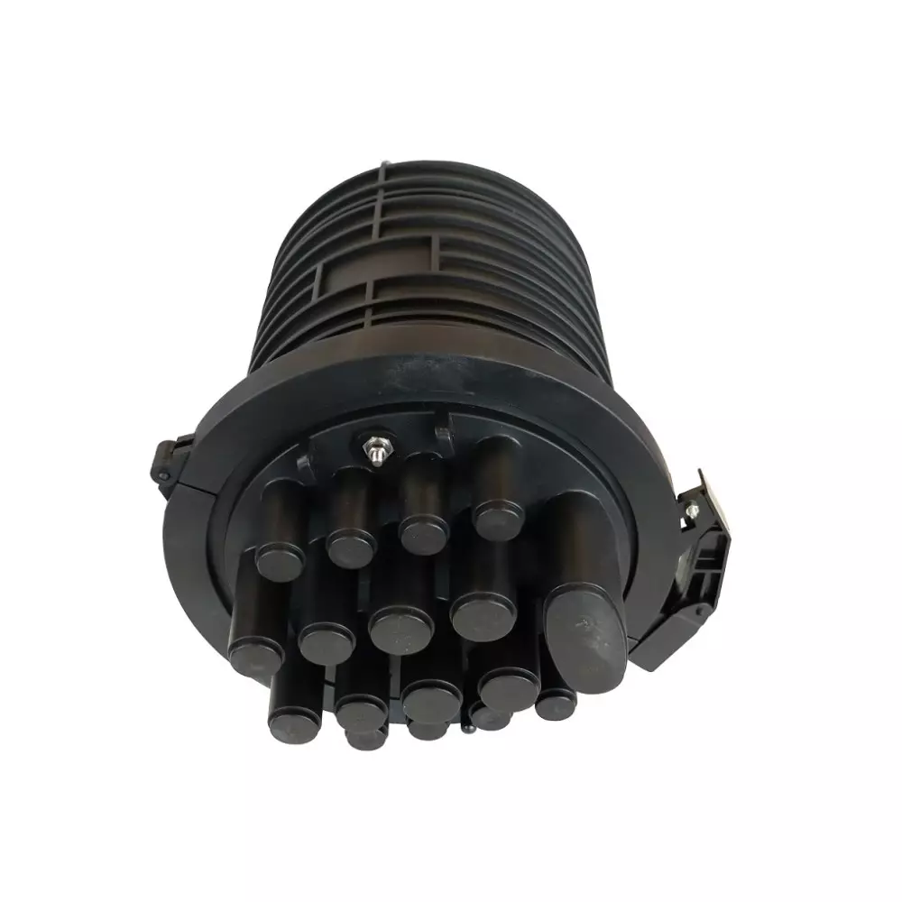 Caja de empalme tipo torpedo IP68 para hasta 288 fusiones de fibra, compacta y versátil, ideal para instalaciones en arqueta, aéreas o subterráneas.