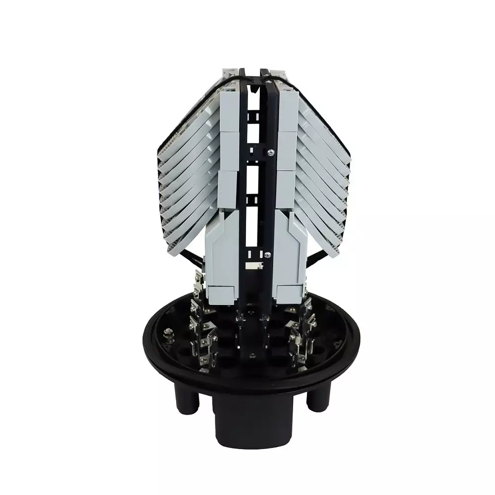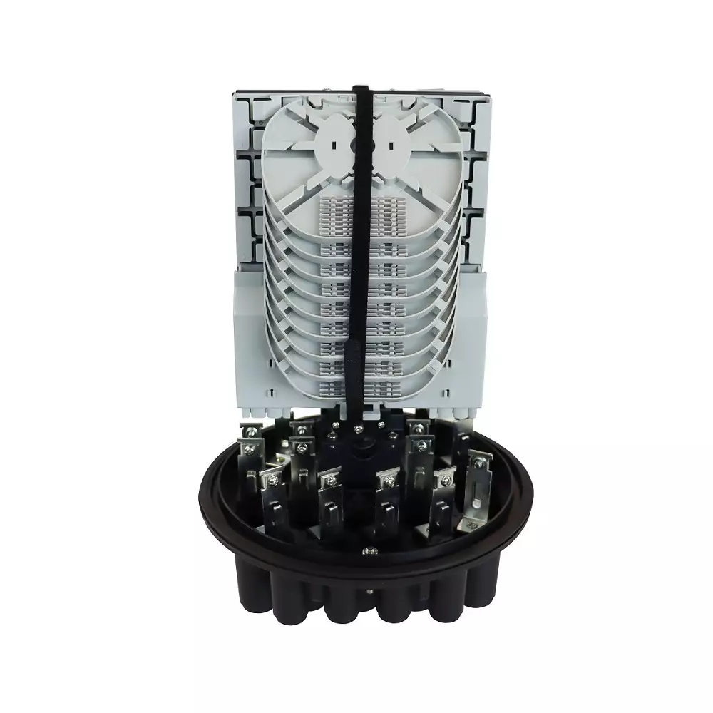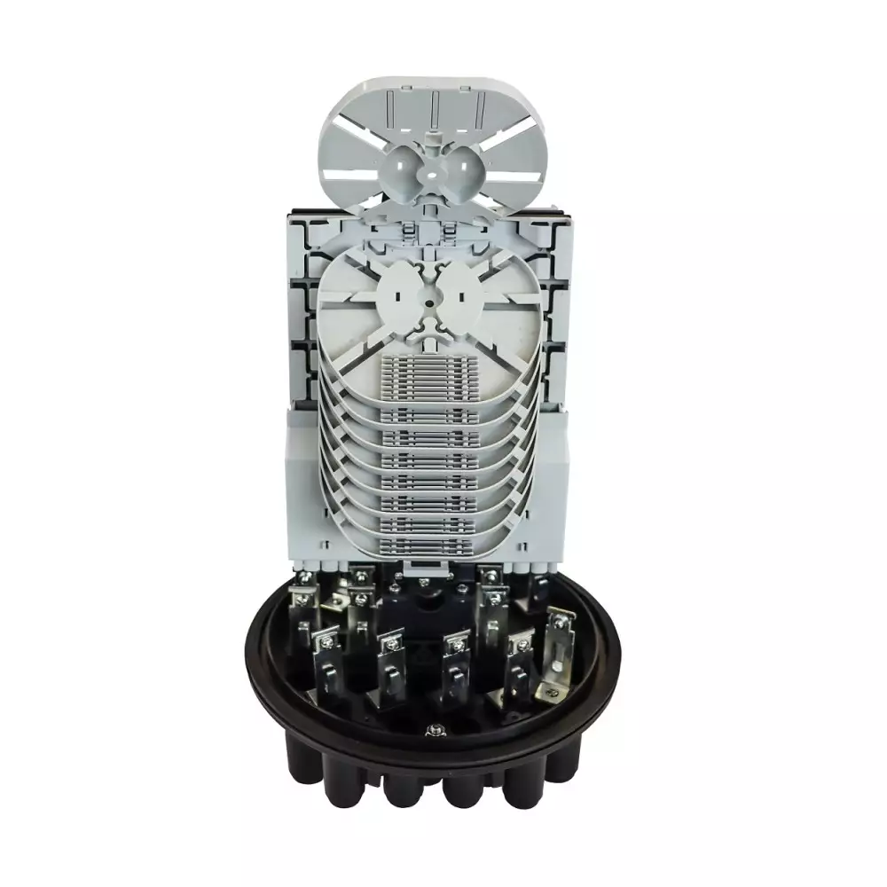 Caja de empalme tipo torpedo FOSC, diseñada para la fusión y distribución de fibra óptica en redes FTTH, backbone o de acceso. Su diseño compacto (300 × 380 mm) y peso reducido (2,5 kg) facilitan la instalación en exteriores, ya sea enterrada, en poste o fijada a pared. El sistema de cierre con junta de silicona y tubos termorretráctiles garantiza un sellado hermético con protección IP68 frente a humedad, polvo y otros agentes externos. Incorpora 18 bandejas de empalme con una capacidad total de hasta 288 fusiones (16 por bandeja), permitiendo una gestión del cableado eficiente y bien organizada.