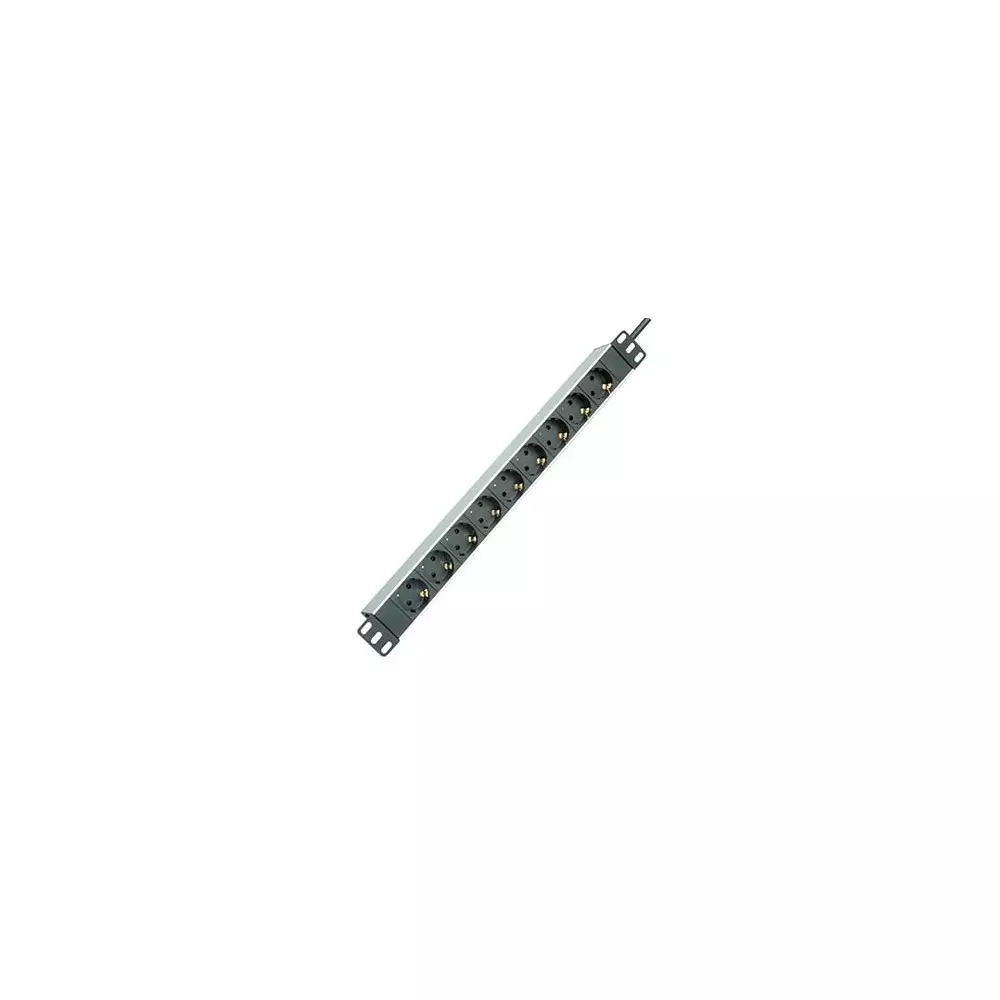 Regleta rack de 19 pulgadas con 16A y 9 tomas schuko, sin interruptor, diseñada para instalación en armario rack o uso independiente. Incluye soportes de metal robustos para montaje flexible en rack de 19 pulgadas, tanto en posición vertical como horizontal.