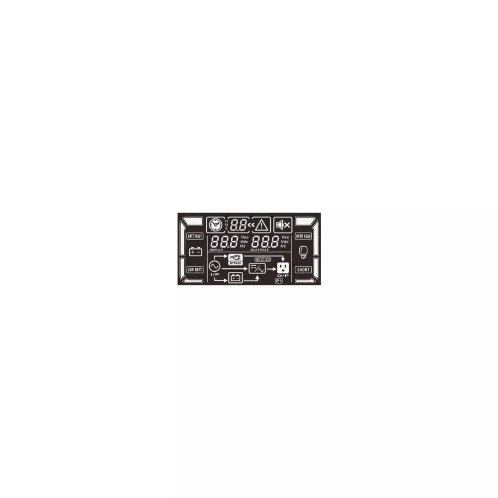 - Estado del SAI, nivel de carga, nivel de batería, Voltaje de entrada/salida, cronómetro de descarga y condiciones de fallo.