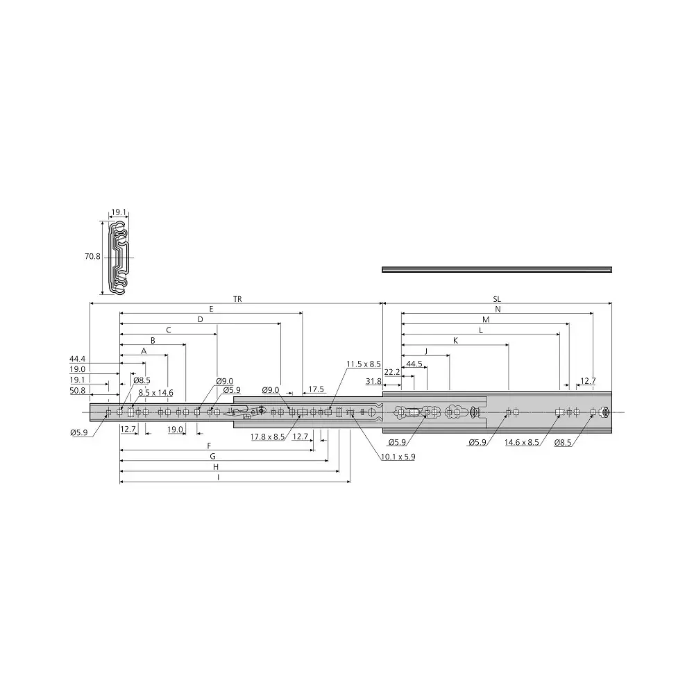 Guía extraible telescópica para servicios pesados Accuride de hasta 160 kgs, con 70,8 mm de altura y 19,1 mm de espesor, acabado en zinc. Gama de longitudes desde 305 mm hasta 914 mm.